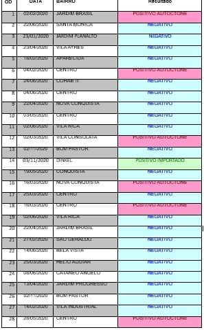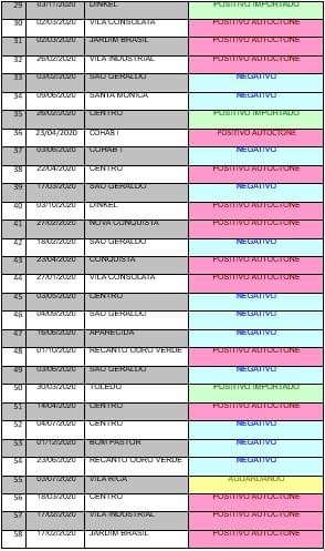 Os casos positivos da doença estão confirmados nos seguintes bairros: sete na região central da cidade, três no jardim Brasil, vila Consolata e Dinkel, dois na vila Industrial e Nova Conquista, um no Recanto Ouro Verde, Cohab I, Conquista e bairro Toledo, na zona rural, entre casos autóctone e importados. Em 33 casos, os exames deram negativos e um caso do Vila Rica aguarda o resultado do exame. Todos os casos positivos, os pacientes se recuperam satisfatoriamente, sem apresentarem maiores problemas.