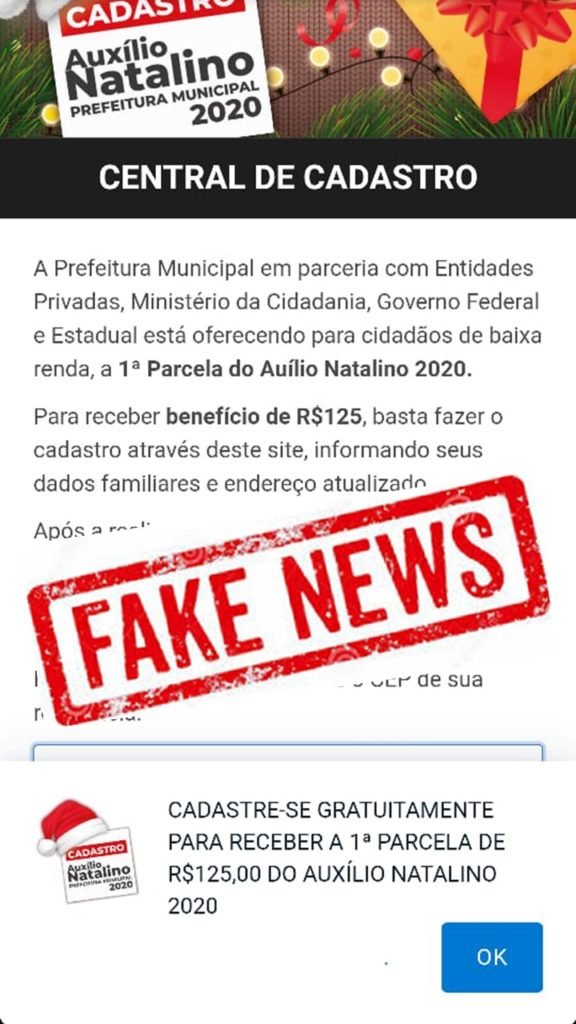 COMUNICADO – A PREFEITURA MUNICIPAL, ATRAVÉS DA DIRETORIA DE PROMOÇÃO SOCIAL, COMUNICA À POPULAÇÃO QUE UMA NOTÍCIA FALSA (“FAKE NEWS”) ESTÁ CIRCULANDO NA INTERNET E PELAS REDES SOCIAIS DE QUE SERÁ CONCEDIDO UM AUXÍLIO NATALINO DE R$ 125 PARA CIDADÃOS DE BAIXA RENDA MEDIANTE CADASTRO ONLINE. VALE FRISAR QUE ESTE AUXÍLIO NÃO EXISTE E NÃO SERÁ CONCEDIDO, PORTANTO, NÃO EFETUEM CADASTRO ALGUM REFERENTE A ESTE BENEFÍCIO, A FIM DE NÃO CORREREM O RISCO DE FORNECEREM SEUS DADOS PESSOAIS À PROVÁVEIS GOLPISTAS QUE ATUAM NO MUNDO VIRTUAL.