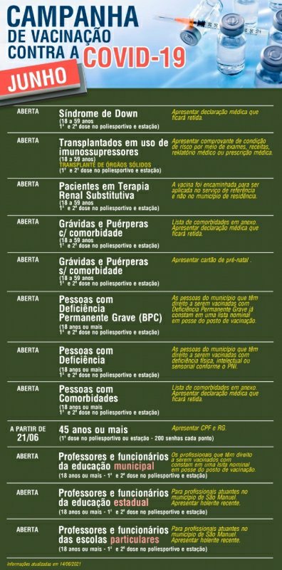 A Diretoria de Saúde informou que haverá a distribuição de 400 senhas/dia, sendo 200 por dia para o POLIESPORTIVO e 200 para a ESTAÇÃO FERROVIÁRIA. O horário de vacinação será das 9h às 15h.