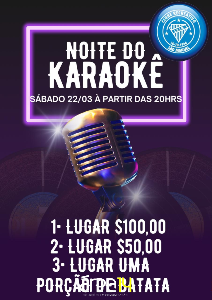 Neste sábado, 22 de março, a partir das 20h, o Clube Recreativo São Manuel será palco de uma animada Noite do Karaokê. O evento promete diversão e música para todos os participantes e oferece prêmios atrativos para os três primeiros colocados: R$100 para o primeiro lugar, R$50 para o segundo e uma porção de batata para o terceiro.