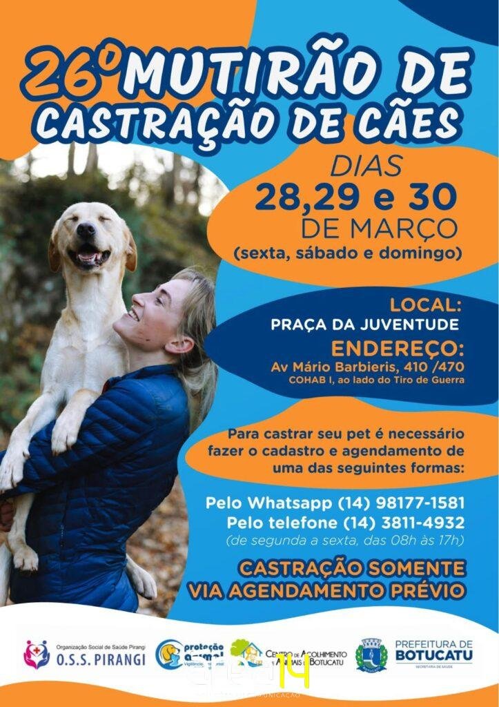 A Secretaria Municipal de Saúde de Botucatu, através do Setor de Castrações Gratuitas, organiza o 26º Mutirão de Castração de Cães, ocorrendo nos dias 28, 29 e 30 de março. O evento será na Praça da Juventude, localizada na Av. Mário Barbieri, 410/470, COHAB I, ao lado do Tiro de Guerra.