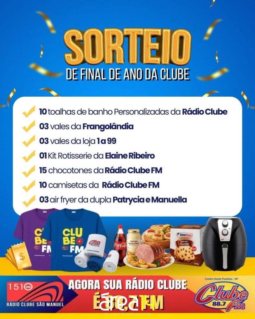A Rádio Clube lançou seu “Final de Ano Premiado”, com sorteios diários até 31 de dezembro. Os ouvintes podem concorrer a diversos prêmios, como toalhas de banho personalizadas, vales-compra, kits de rotisserie, chocotones, camisetas promocionais e air fryers, participando da programação especial de fim de ano.