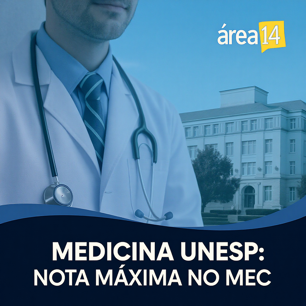 Prompt de Imagem: “Graphic design for news, background related to medical education excellence, showing a doctor with a stethoscope or a university building, 1:1 aspect ratio. Add ‘área 14’ logo in the top-right corner: the word ‘área’ in white and the number ’14’ in yellow. Dark gradient at the bottom with the text ‘MEDICINA UNESP: NOTA MÁXIMA NO MEC’ in white bold Sans Serif font. The overall visual theme should use Blue tones.”