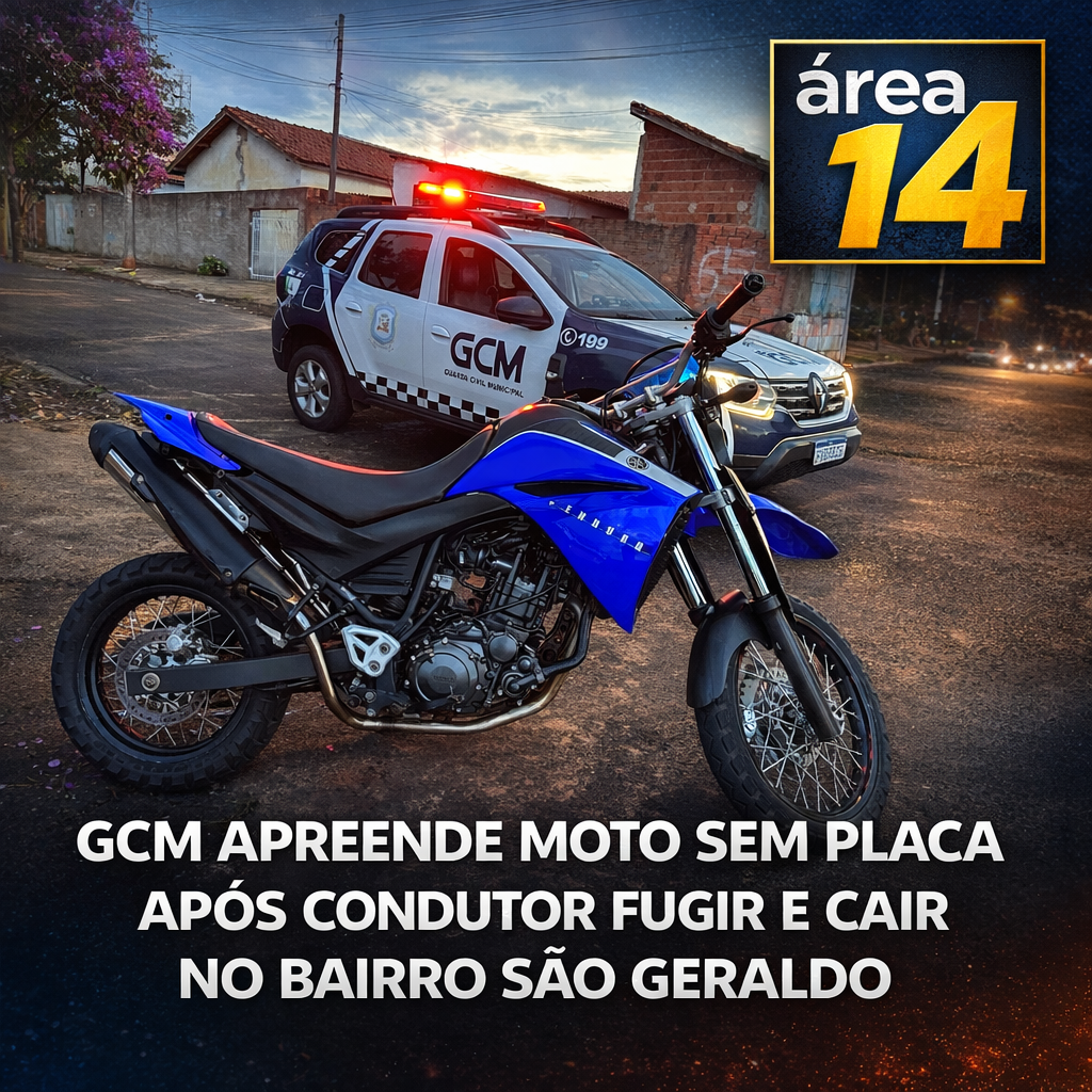 Uma ação da Guarda Civil Municipal resultou na apreensão de uma motocicleta irregular no bairro São Geraldo. O condutor, que estava sem capacete, tentou escapar da abordagem, caiu com o veículo e fugiu a pé, abandonando a moto no local.