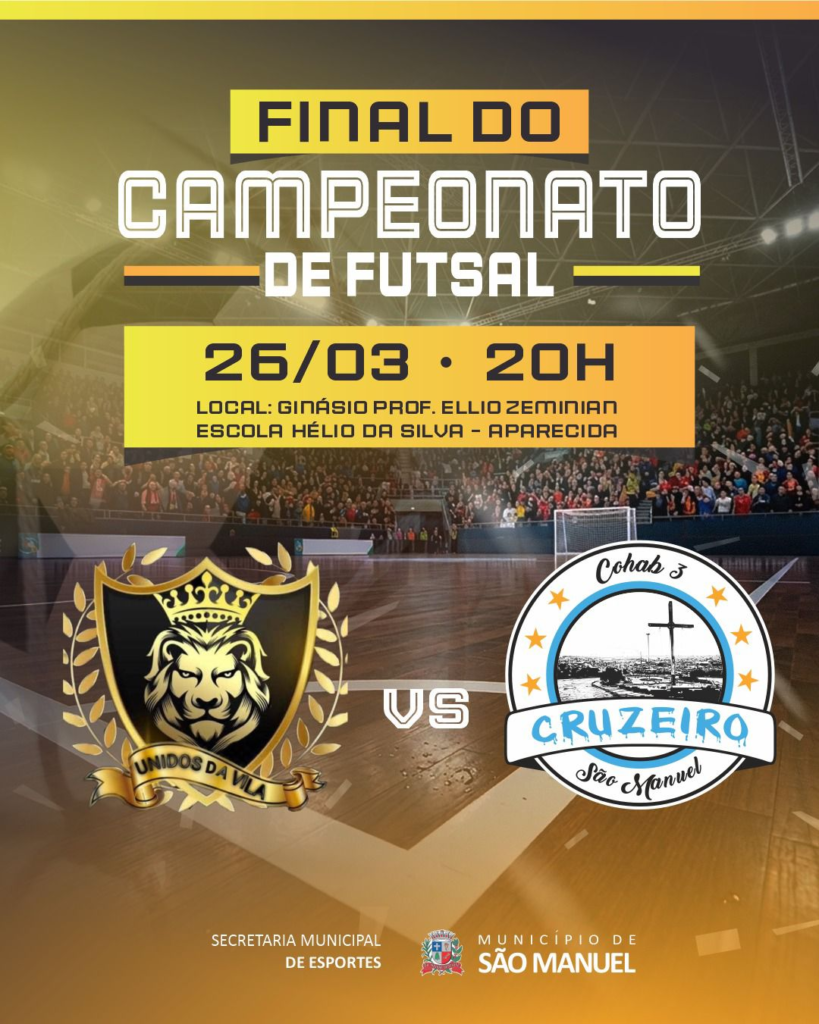 A grande final do Campeonato Municipal de Futsal de São Manuel acontece nesta quinta-feira, 26 de março, a partir das 20h, no Ginásio Prof. Hélio Zeminian, na Escola Hélio da Silva, no bairro Aparecida.