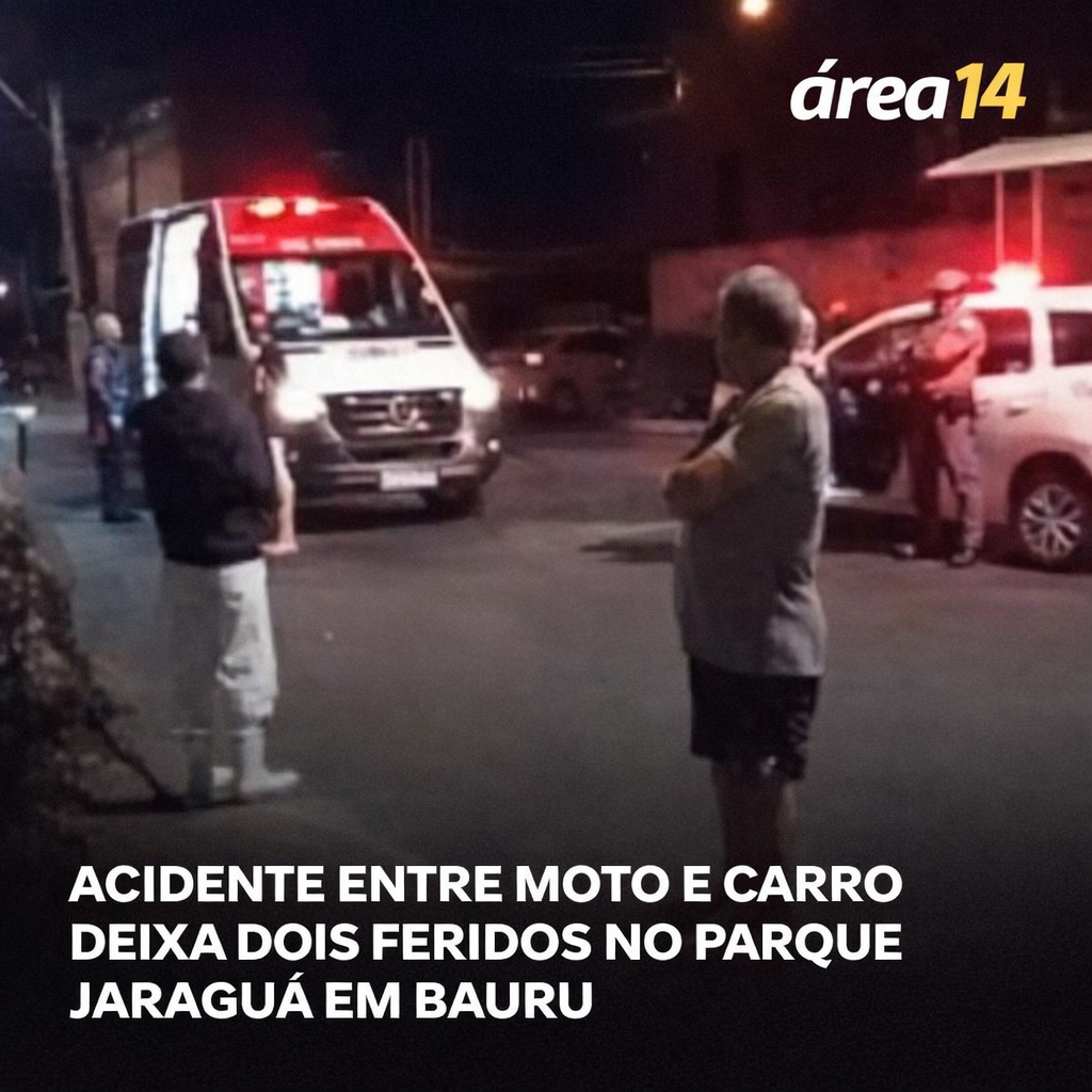 Na noite desta terça-feira (31), uma colisão entre uma moto e um carro deixou duas pessoas feridas no Parque Jaraguá, em Bauru. O acidente ocorreu no cruzamento da rua Professor Ayrton Busch com a alameda Ptolomeu. As vítimas foram socorridas pelo Samu e levadas ao Pronto-Socorro Central.