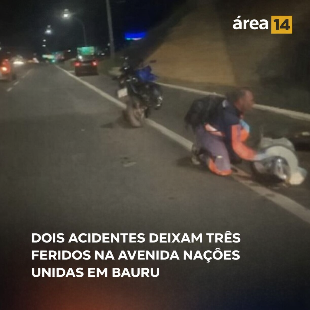 Três pessoas ficaram feridas no início da noite desta terça-feira (14) em dois acidentes quase simultâneos na Avenida Nações Unidas, em Bauru. Uma moto foi atingida por um carro e um pedestre foi atropelado. As vítimas foram socorridas e levadas ao Pronto-Socorro Central.