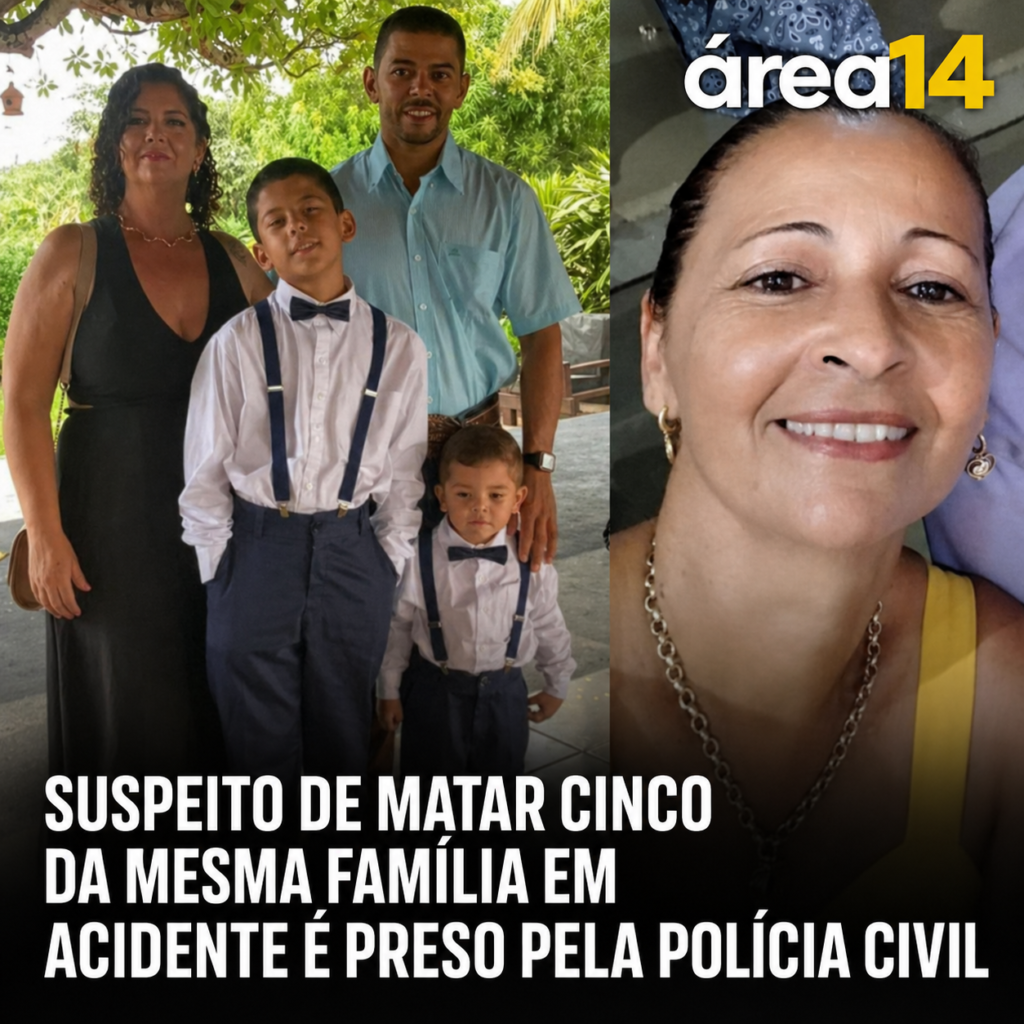 CRIE E EXIBA A ESCRITA Do Prompt: Graphic design for news, 1:1 aspect ratio. Add ‘área 14’ logo in the top-right corner: the word ‘área’ in white and the number ’14’ in yellow. Dark gradient at the bottom with the POLÍCIA CIVIL PRENDE MOTORISTA ENVOLVIDO EM ACIDENTE QUE MATOU FAMÍLIA in white bold Sans Serif font.