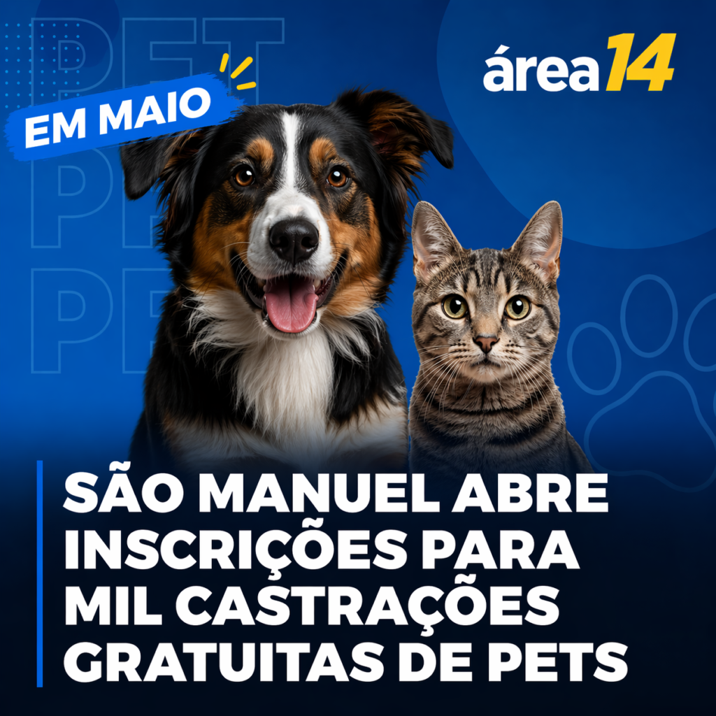 A Prefeitura de São Manuel realizará um mutirão de castração gratuita para mil cães e gatos entre os dias 8 e 10 de maio. Para participar, os moradores devem obrigatoriamente cadastrar seus animais no sistema federal SinPatinhas e, em seguida, realizar o agendamento no site oficial do evento.