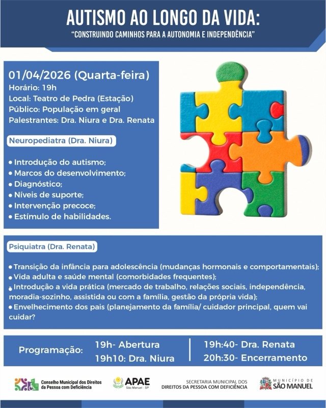 A Prefeitura de São Manuel promove nesta quarta (01/04) e quinta-feira (02/04) uma programação especial pelo Dia Mundial de Conscientização do Autismo. As ações buscam a inclusão e a valorização das capacidades de pessoas com TEA.